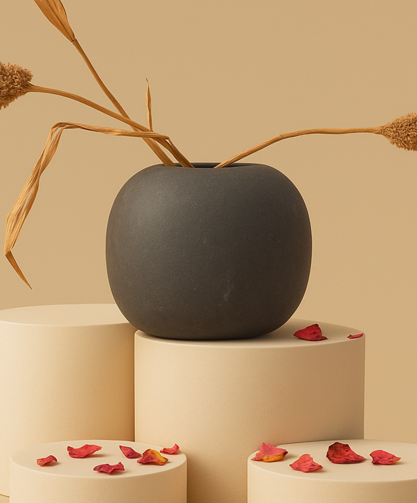 SIMPLICITY MEETS SCULPTURE IN THE QUIET ROUND — A GLOBE-SHAPED VASE THAT REFLECTS THE PHILOSOPHY OF INTENTIONAL LIVING. PART OF OUR QUIET FORMS SERIES, THIS PIECE IS AN ODE TO GENTLE DESIGN AND EARTHY PRESENCE.
